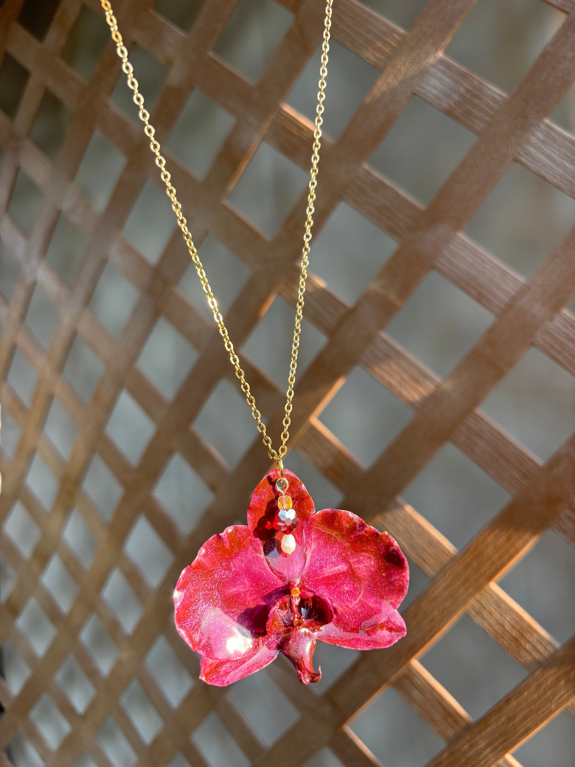 Orquídea Burgandy brillosa con una perla de agua dulce y cadena Stain Steel