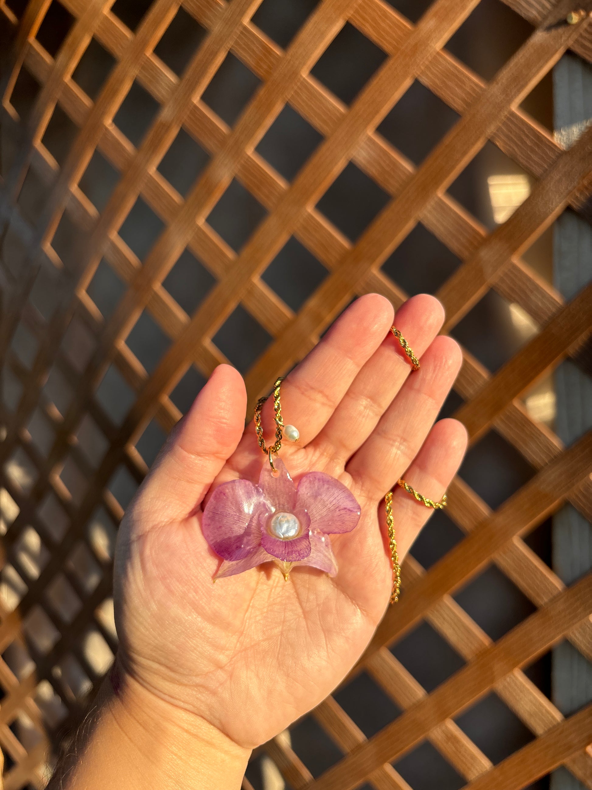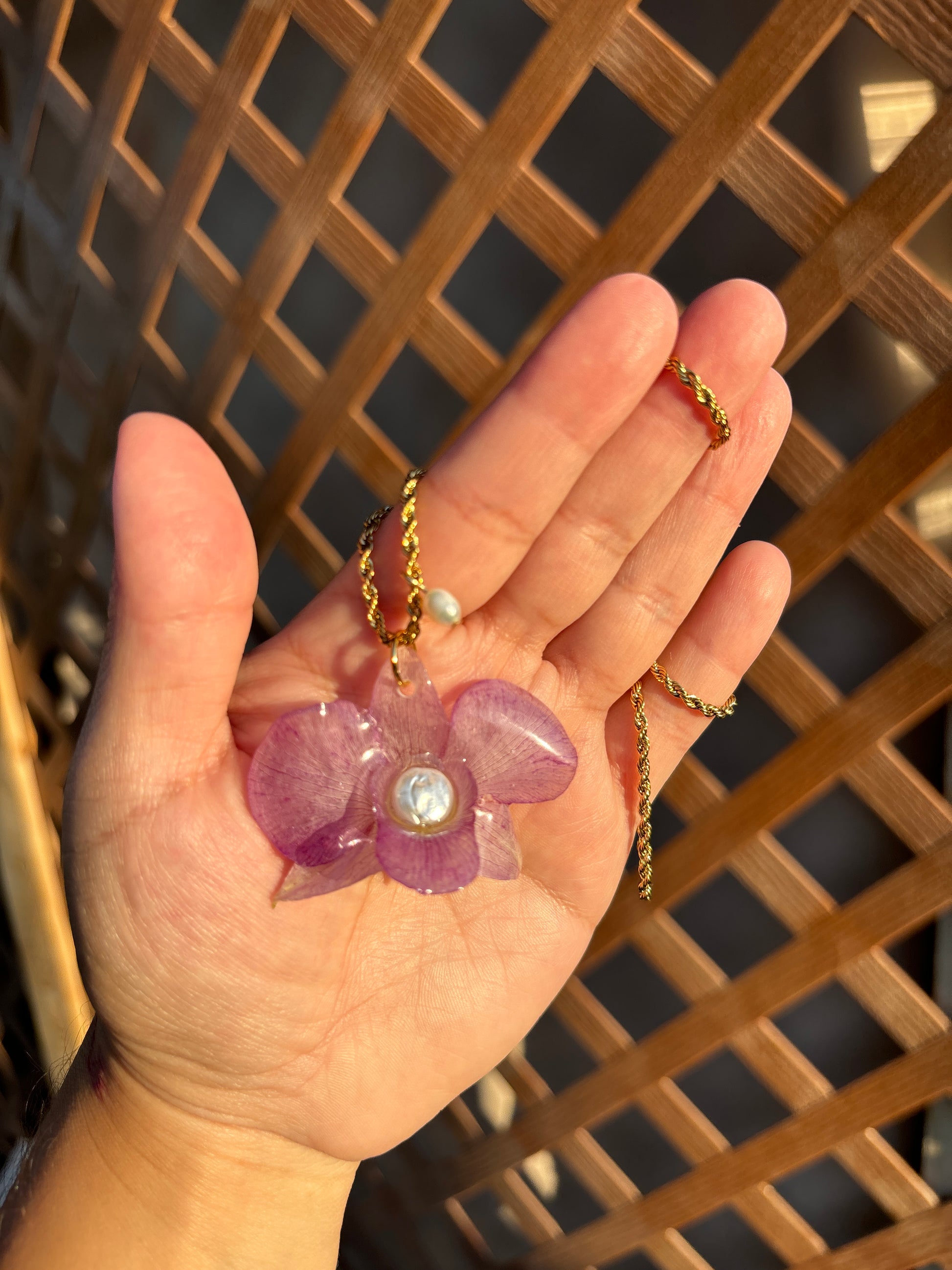 Orquídea mediana lila, en cadena stein steel y una perla de agua dulce.
